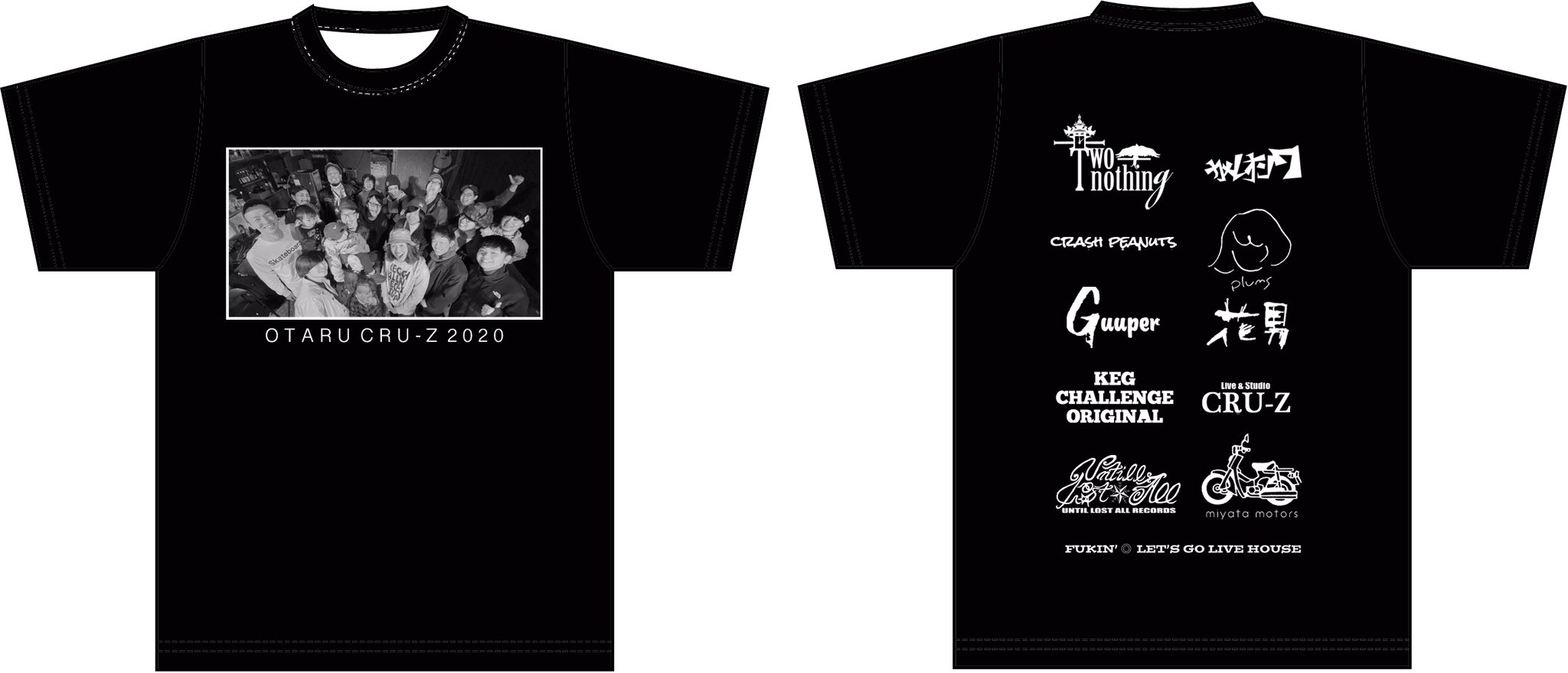 いま自分たちができる事をという事で、市内のライブハウス「Live&Studio CRU-Z」を支援したいという思いから、花男さんとムーさんで話し合いをし、賛同してくれた小樽バンドの仲間たちと支援Tシャツを制作。
