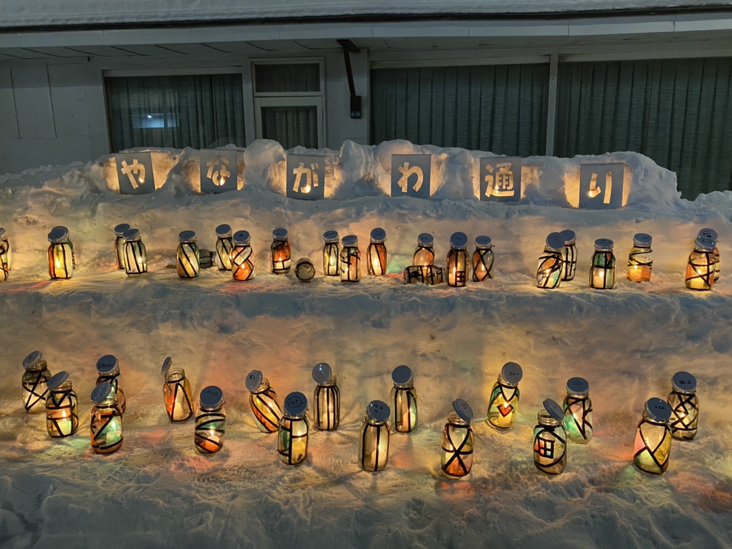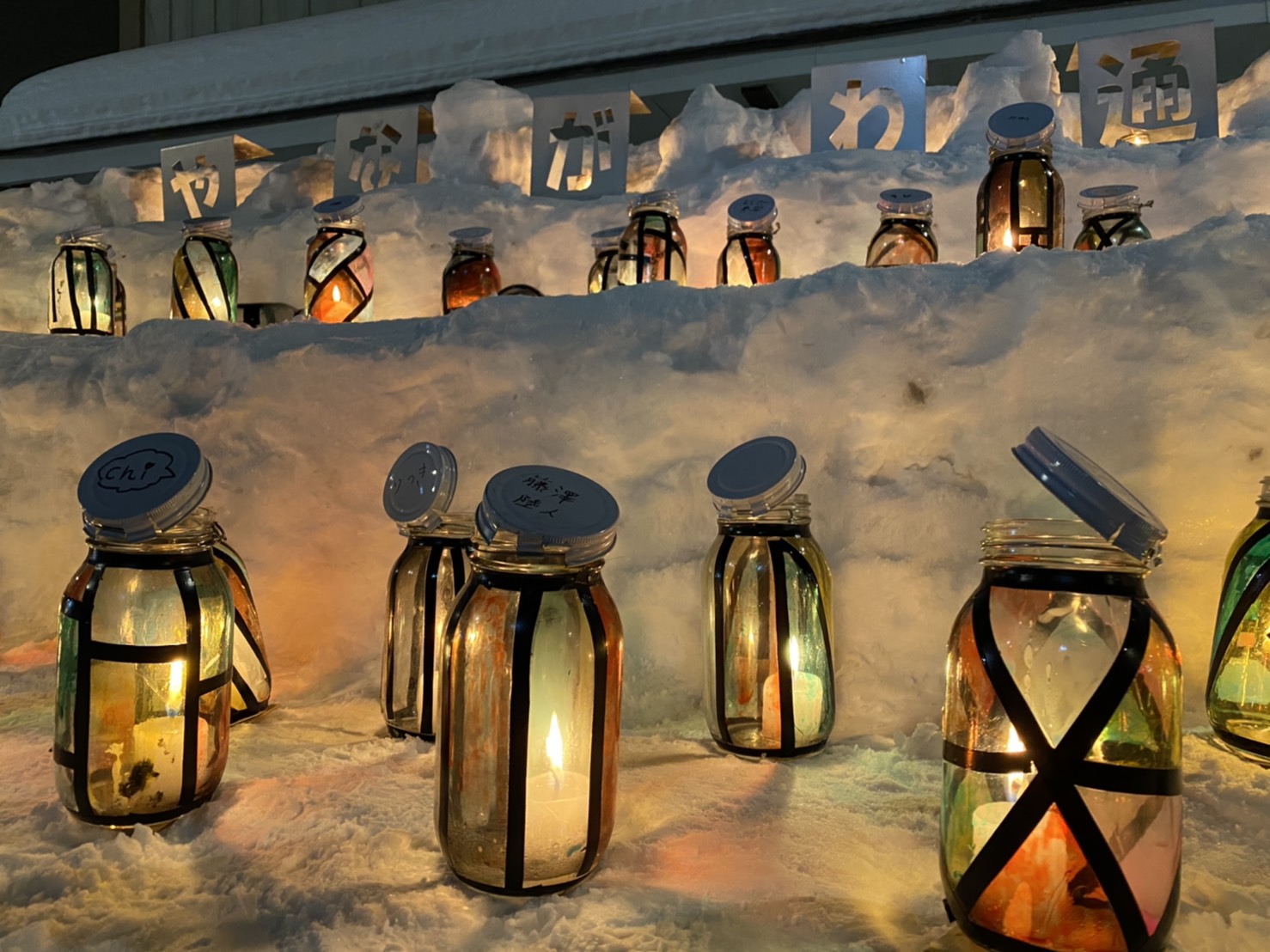 梁川通りの雪あかりは、瓶に黒テープで模様をつけて塗料を塗ります。その中にキャンドルを入れるとステンドグラスのような灯りになるんです。